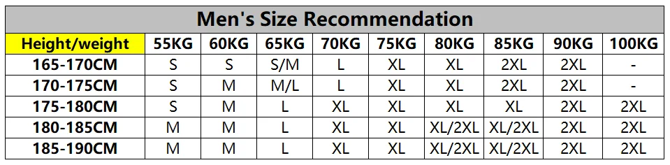 | Tabela de tamanhos masculinos(Unidade: cm) | |||||